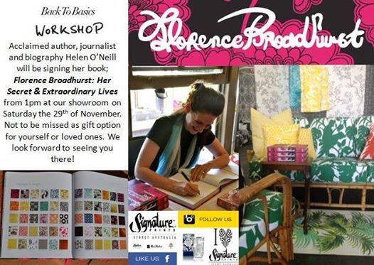 Saturday November 23, 2013 Helen O’Neill joins Paulene Graham, who worked with Australia’s remarkable designer Florence Broadhurst in the 1970s, and Signature Prints’ Helen Lennie for a special, hands-on, Broadhurst printing workshop at Signature Prints’ in Rosebery. Australians can buy the new, deluxe edition of O’Neill’s beautiful biography Florence Broadhurst: Her Secret and Extraordinary Lives online here.