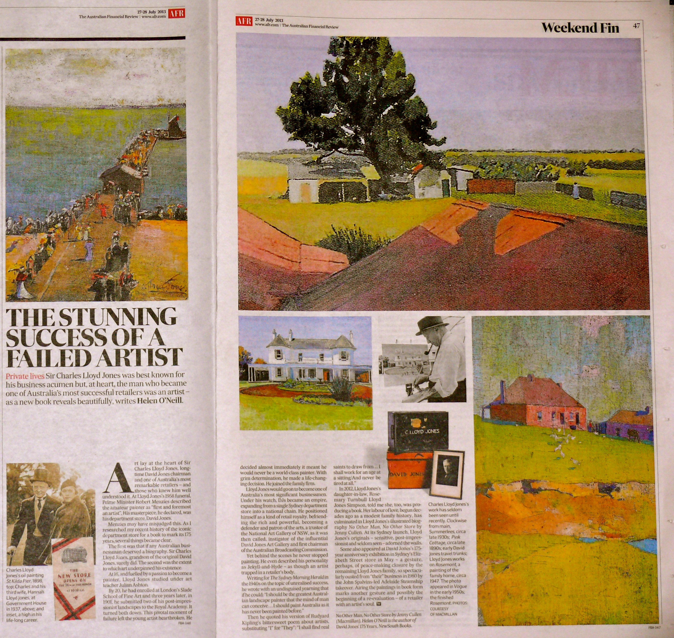 Saturday July 27, 2013 The Weekend Fin section of The Australian Financial Review publishes ‘The Stunning Success of a Failed Artist’, Helen O’Neill’s article on the new book No Other Man, No Other Store by Jenny Cullen. Of this biography of Sir Charles Lloyd Jones, the colourful, long-time David Jones chairman and a passionate amateur painter, O’Neill observes: ‘Airing [Lloyd Jones’s] paintings in book form marks … possibly the beginning of a re-evaluation – of a retailer with an artist’s soul.’